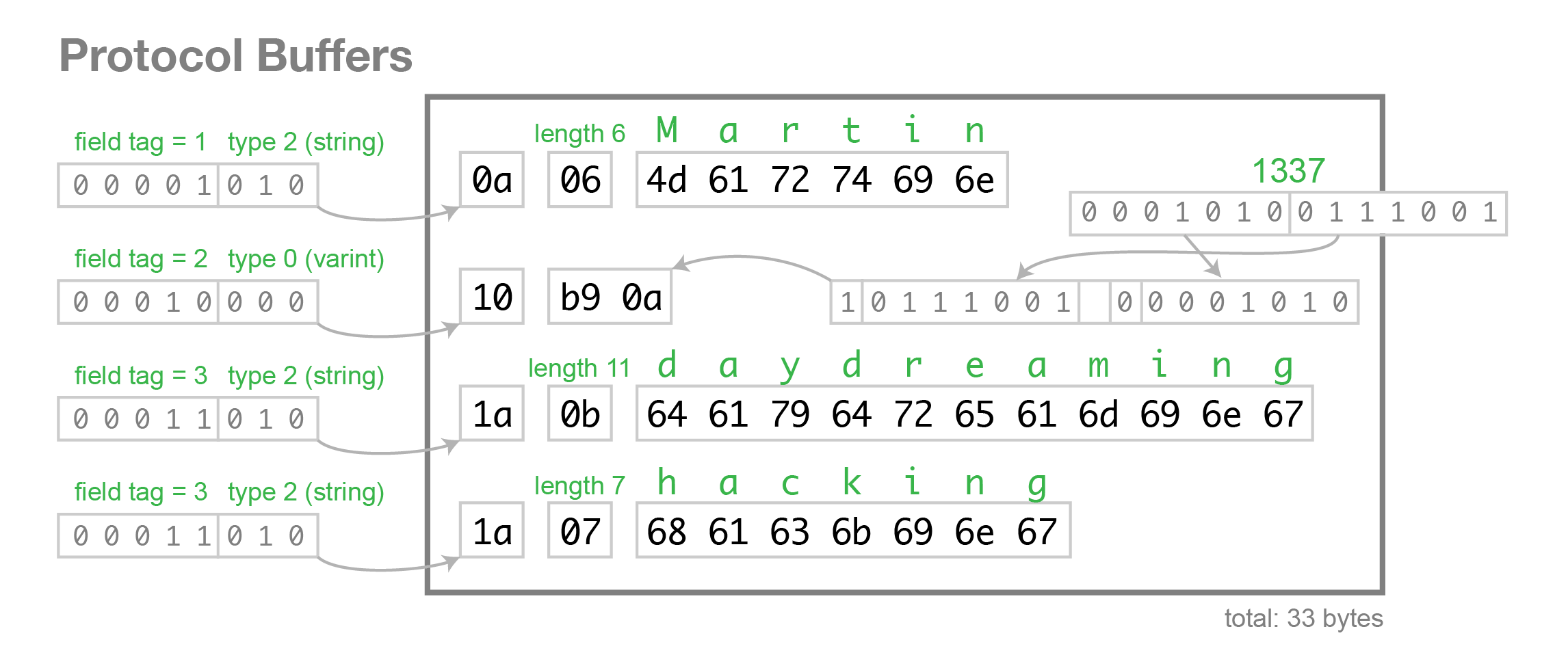 我们知道,Protobuf message 是一系列的键值对。在进行序列化时,对于 key 只序列化它的类型和编号;反序列化时,只有根据 .proto 文件才能确定某个 key 具体的含义是什么。这一点也是 Protobuf 比 JSON、XML 更安全的原因,如果没有数据结构描述 .proto 文件,拿到数据以后也是无法解析成正常的数据的。