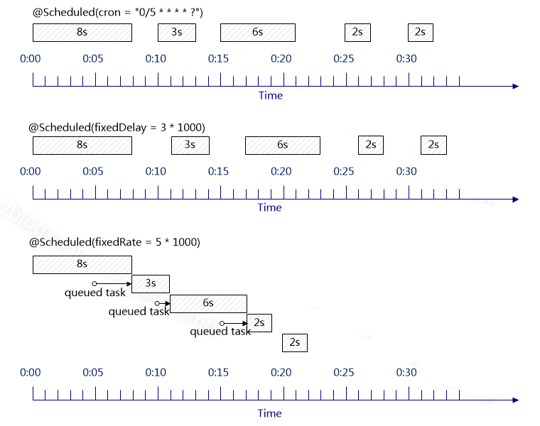 - fixedRate: 上次执行完毕后,比较编排时间和当前时间。如果超过编排时间,立即执行;如果未到编排时间,等待到编排时间。