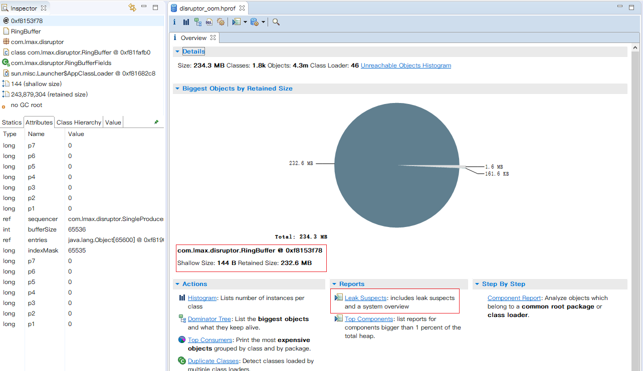 回到报告,在 ② 处说明了 RingBuffer 队列底层的 entries 数组,其 Shallow Heap 只有 144 byte,而 Retained Heap 有 243879304 byte,说明其引用了大量可以被 GC 的对象。在 ③ 处展示 entries 数组中每一项元素,也可以看出来。
