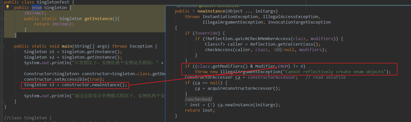 当反射调用构造方法时,抛出异常,这里的根本原因是反射对于枚举类型,无法通过构造方法创建实例。