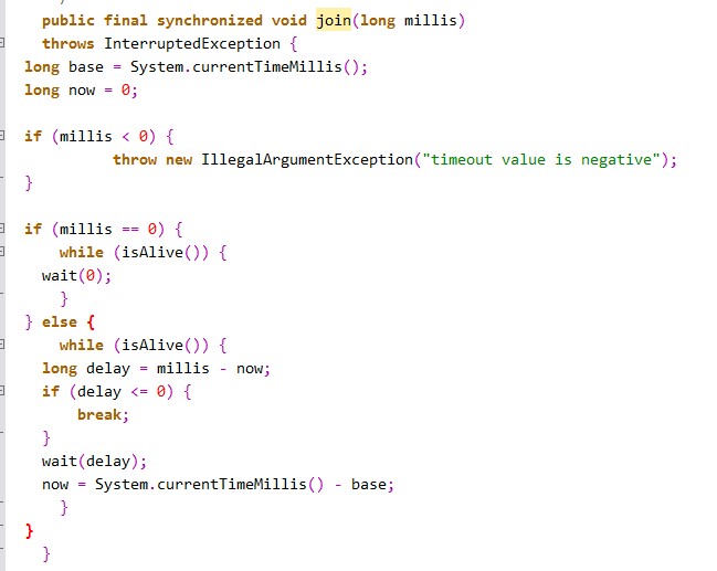 假如在main线程中,调用thread.join方法,则main方法会等待thread线程执行完毕或者等待一定的时间。如果调用的是无参join方法,则等待thread执行完毕,如果调用的是指定了时间参数的join方法,则等待一定的事件。