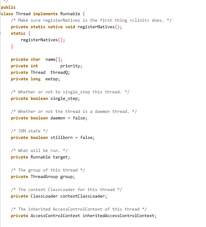 Thread类实现了Runnable接口,在Thread类中,有一些比较关键的属性,比如name是表示Thread的名字,可以通过Thread类的构造器中的参数来指定线程名字,priority表示线程的优先级(最大值为10,最小值为1,默认值为5),daemon表示线程是否是守护线程,target表示要执行的任务。