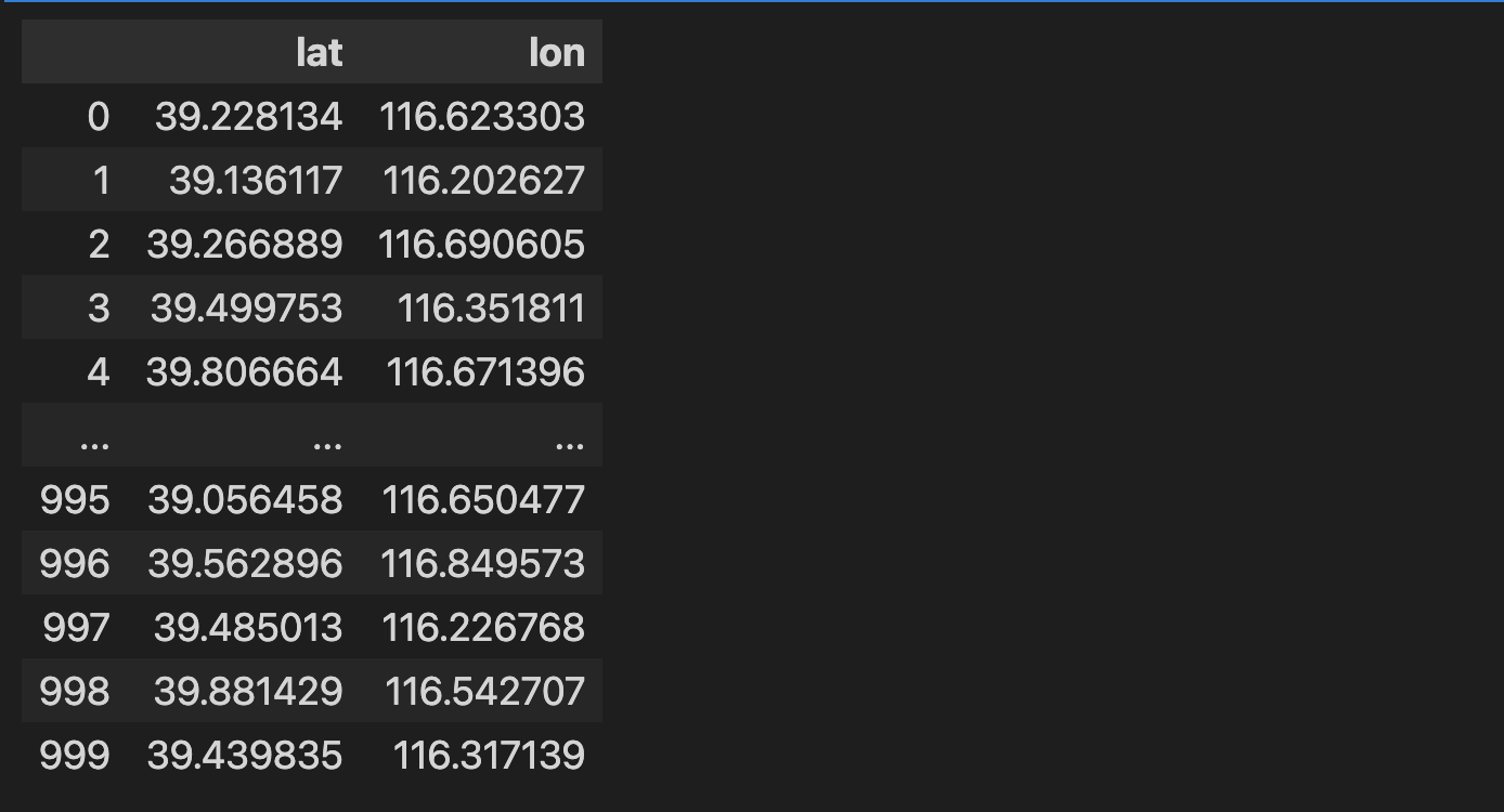 sampledata = pd.DataFrame({'lat': 39 + np.random.rand(1000),