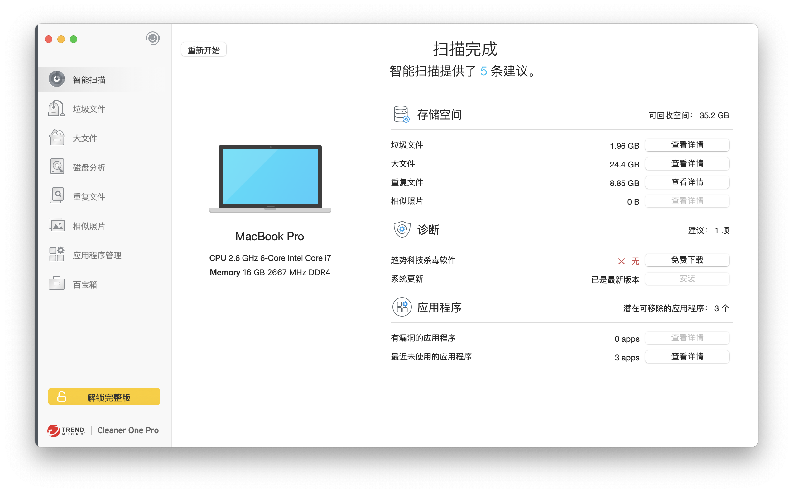 - 智能扫描:会统计相关的垃圾文件、大文件、重复文件、相似图片等。