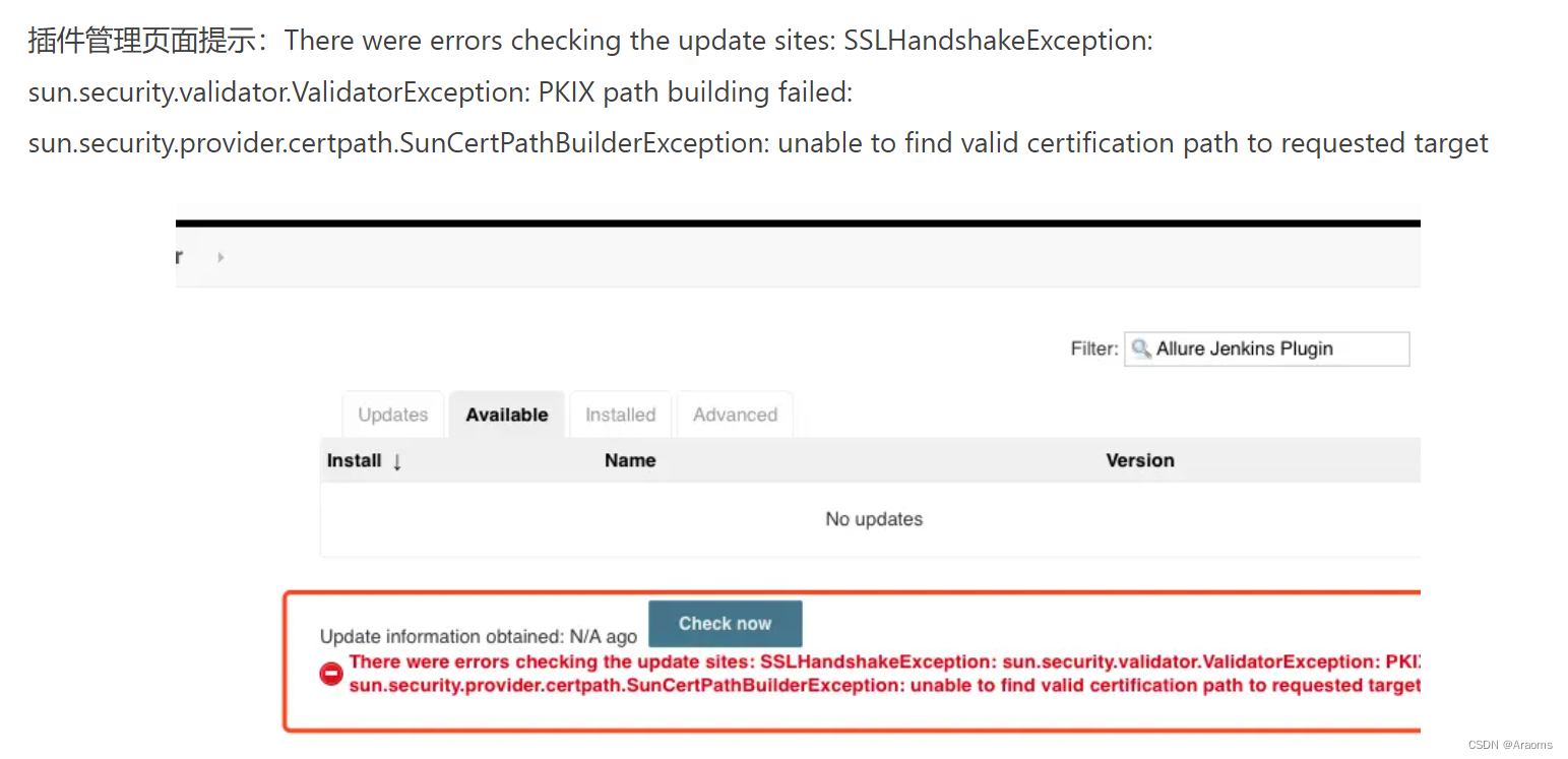 直到遇见这个链接:jenkins插件管理报错There were errors checking the update sites解决 - 简书