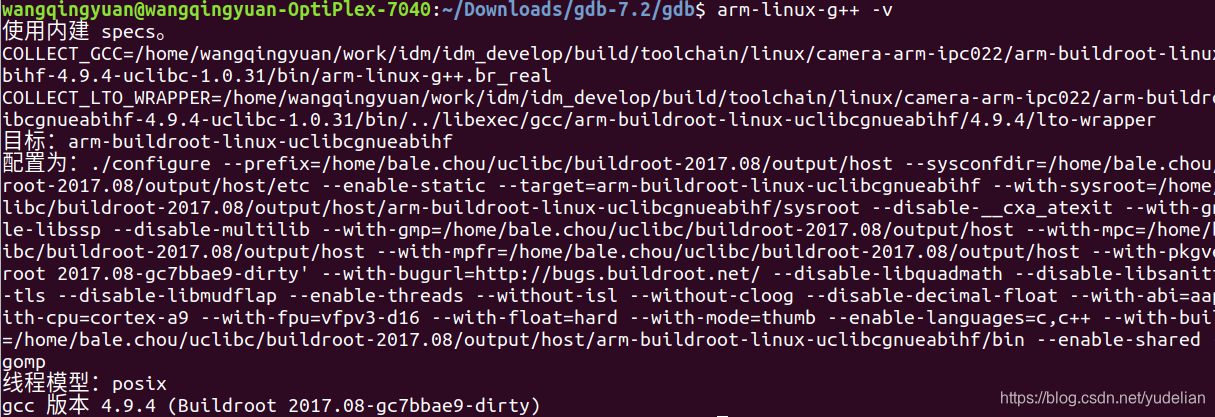 如下获取编译工具链的版本,arm-linux-g++ -v,里的Target或者目标就是,我的这个为