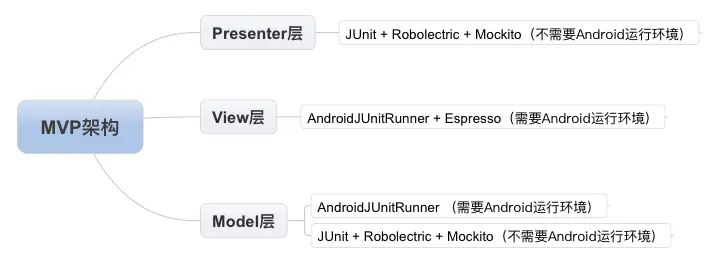 Presenter层仅仅处理业务逻辑,不需要处理UI等,选择直接运行在JVM环境上的框架;View层都是UI相关的东西,这个没的选择;Model层有2种选择,一种类似于数据库存储、SharePreference数据读取,它必须运行在Android环境上才方便测试,一种类似于Restfull Api接口请求之类的,它在JVM环境上是可以直接运行的,所以这里我选择了2种框架,具体根据实际情况来选择。