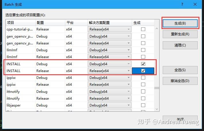 之后再次点击configure,之后还是如上面一样会显示红色区域,这次只在此点击configure几个,之后就不会出现红色区域了,configure done,之后点击generate,等待完成,之后,点击open project,之后VS2017开始加载项目,可能需要一些时间,加载完成之后,点击菜单栏 的生成-->>批生成,之后选择INSTALL下的debug和release,点击生成,等待N个小时生成完成,之后的电脑环境变量配置和VS2017的配置与没有opencvcontrib的opencv一样,只是需要替换成成你第一步选择的build文件夹下install文件夹下相应的文件路径即可,如lib,include,opencv_world400d.lib!