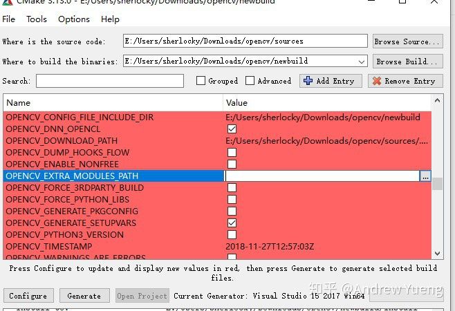 点击finish之后稍等片刻,会出现红色的图片,稍安勿躁,把opencv-contrib4的source code 文件夹下的modules的路径复制到OPENCV-EXTRA_MODULES_PATH,并把其上面的OPENCVENABLENONFREE选择上
