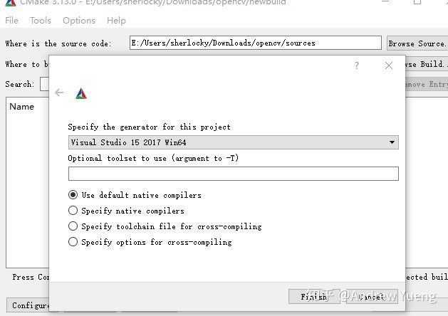 打开cmake-gui,之后选择opencv的source code文件夹和放编译之后生成的文件的文件夹(习惯为build,也可以为其他文件夹,下面以build文件夹为例),另需要把BUILD_opencv_world后面的方框打上对号(选择上),你后面配置VS2017的时候需要用到这个文件,之后点击configure,选择