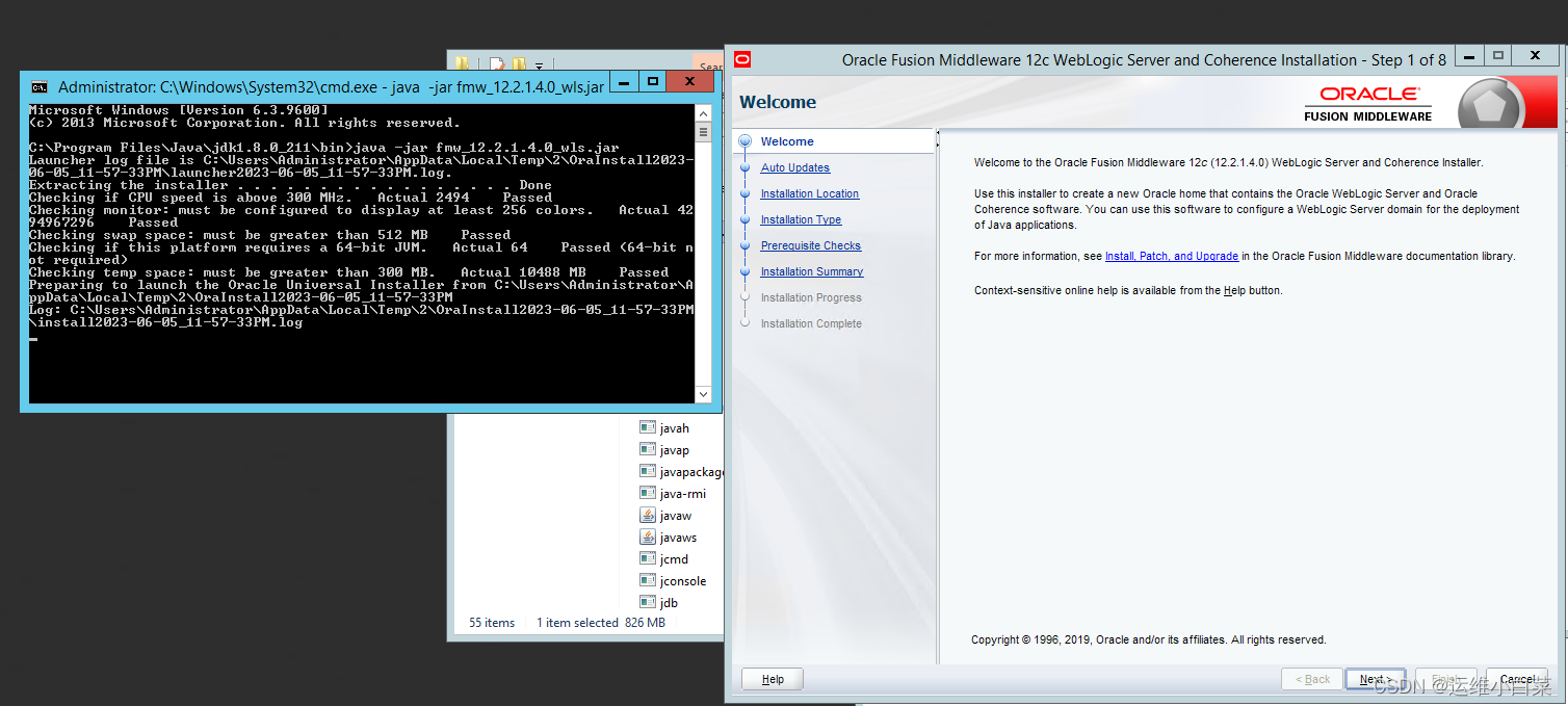 打开命令行,切换至安装包目录。(因为我的服务器是Windows Server 2012R2 所以就放到jdk目录下安装)java -jar fmw_12.2.1.4.0_wls.jar