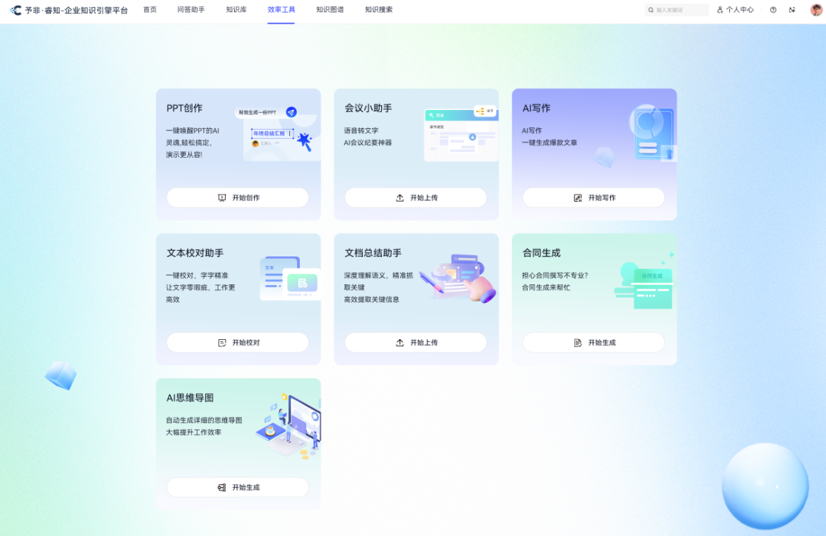 在内容生产的全流程中,予非・睿知企业知识中台构建了一套完备的效率工具矩阵,涵盖AI写作、PPT创作、文档总结助手、文本校对等核心功能,以智能化手段重构行业生产力。在创作环节,AI写作模块依托行业知识库,深度剖析用户需求,自动生成逻辑严密的脚本大纲与策划案框架,有效避免因创意断层导致的损耗,为内容创作注入高效动能;协作层面,会议小助手凭借实时语音转写技术,将研讨内容即时转化为结构化知识卡片,关键信息留存率提升,打破传统会议记录的信息衰减瓶颈;而在内容审核环节,敏感词检测与语法纠错功能形成双重保障机制,通过精准识别违规内容与语言错误,使内容审核效率提升,有力规避政策风险,确保输出内容既符合行业规范,又满足高质量传播需求。