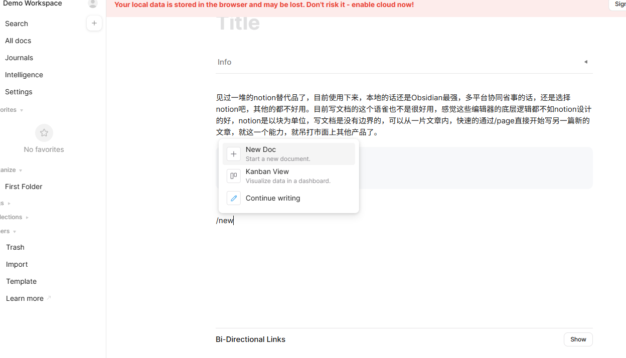 见过一堆的notion替代品了,目前使用下来,本地的话还是Obsidian最强,多平台协同省事的话,还是选择notion吧,其他的都不好用。目前写文档的这个语雀也不是很好用,感觉这些编辑器的底层逻辑都不如notion设计的好,notion是以块为单位,写文档是没有边界的,可以从一片文章内,快速的通过/page直接开始写另一篇新的文章,就这一个能力,就吊打市面上其他产品了。但是affine这款软件的整体使用下来,感觉还好,但是还是没有给人一个迁移的冲动🤪。