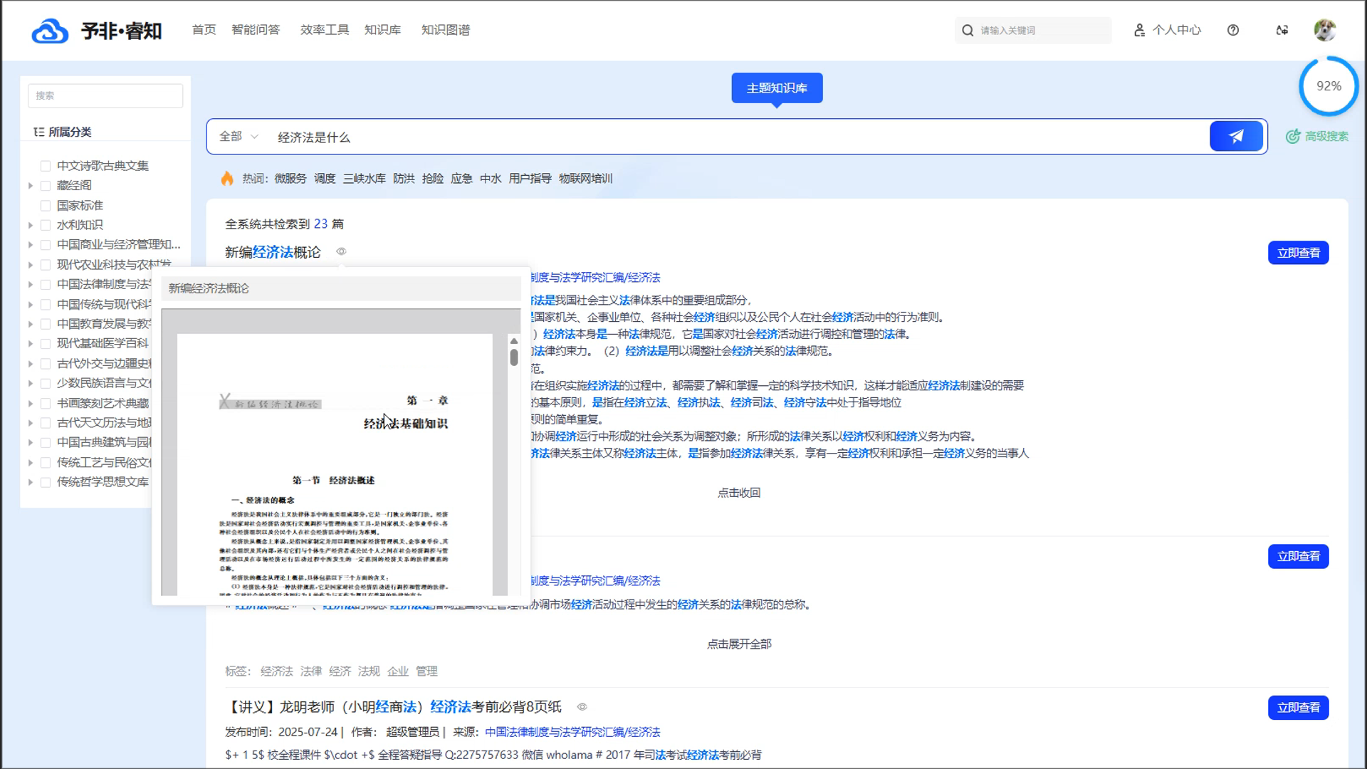 智能化的知识检索与筛选: 产品提供强大的智能搜索功能,用户可以通过输入关键词,快速在海量的知识库中进行检索。同时,系统支持多种筛选和排序方式,例如“综合排序”、“最新发布”、“最多浏览”和“最多收藏”,帮助用户更精准地定位所需信息。