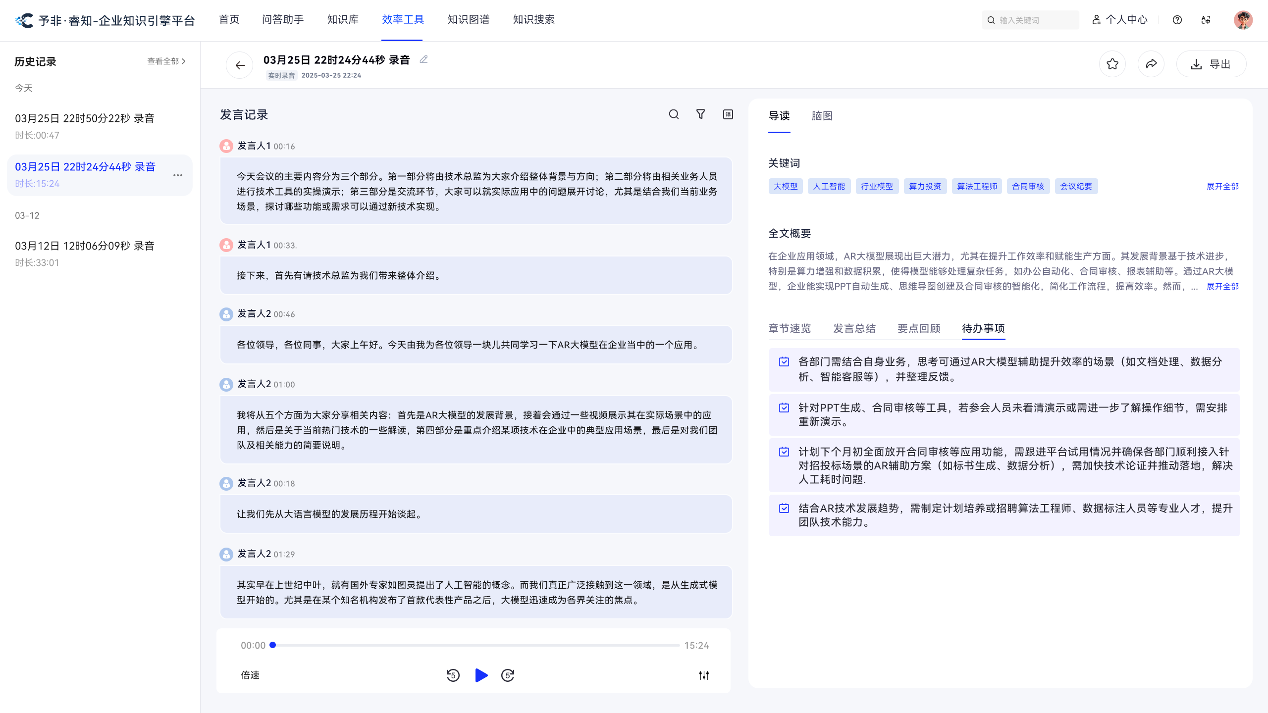 会议结束,真正的考验才刚刚开始。面对几万字的录音转写稿,整理会议纪要无异于一场噩梦。而现在,一杯咖啡的工夫,一份重点分明、条理清晰的会议纪要便已生成。AI能自动提炼核心观点、总结关键决策,最妙的是,它还能识别出待办事项,自动生成任务。这种从讨论到行动的无缝衔接,确保了每一次会议的成果都能落地生根,让团队执行力瞬间拉满。
