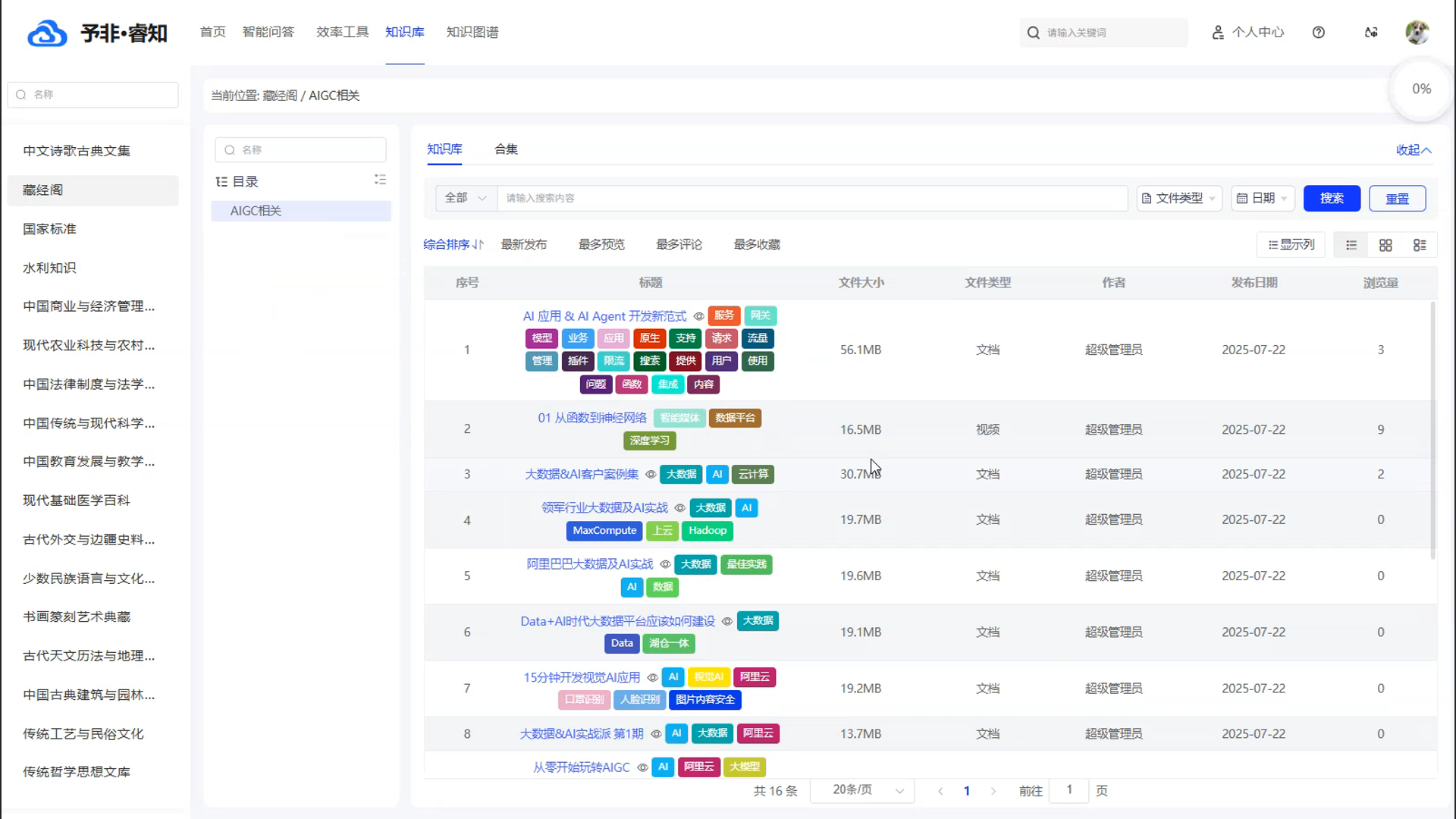 智能化的知识检索与筛选: 产品提供强大的智能搜索功能,用户可以通过输入关键词,快速在海量的知识库中进行检索。同时,系统支持多种筛选和排序方式,例如“综合排序”、“最新发布”、“最多浏览”和“最多收藏”,帮助用户更精准地定位所需信息。