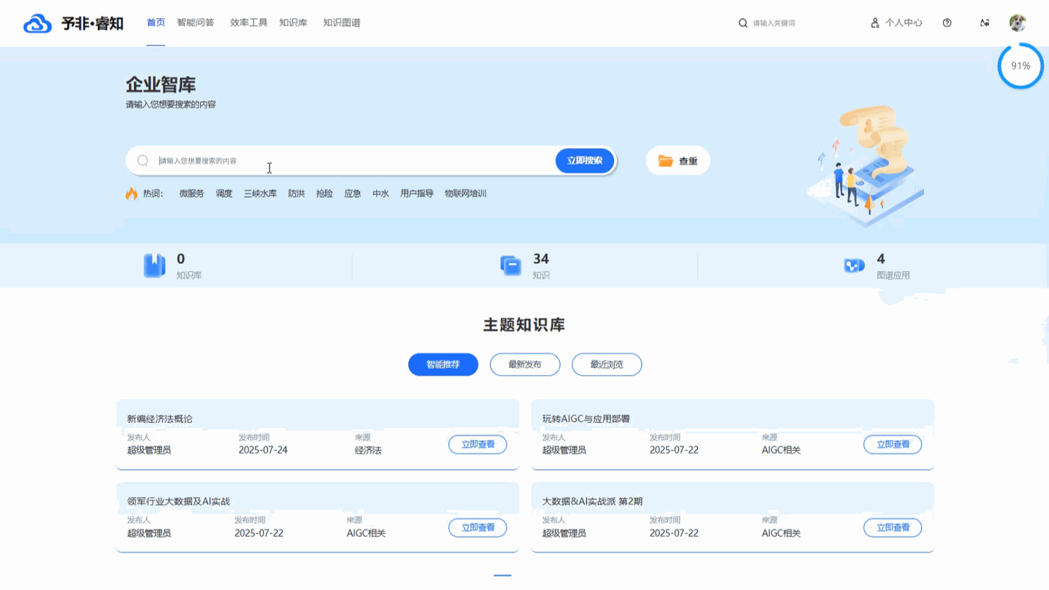 AIGC 与大模型深度赋能: 本产品并非简单的知识存储容器,而是深度融合了前沿 AIGC 与大模型技术的智能工作伙伴。它能够实现文档自动摘要、智能问答、内容关联推荐等高级功能,将沉睡的数据和文档激活为可以对话、可以思考的动态知识,极大提升知识的应用效率与创新价值。