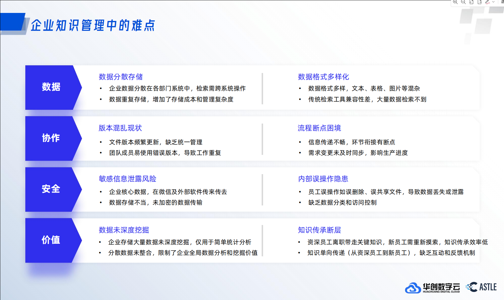 - 知识的“孤岛化”与“非标化”: 企业的知识散落在各个部门的服务器、员工的本地硬盘、不同的SaaS应用乃至微信聊天记录中。这些数据不仅物理上分散,格式也千差万别——从结构化的数据库表格,到半结构化的Word、PPT,再到完全非结构化的PDF扫描件、图片和会议录音。这导致知识无法被统一、有效地管理和利用,形成了一个个价值巨大的“数据孤岛”。