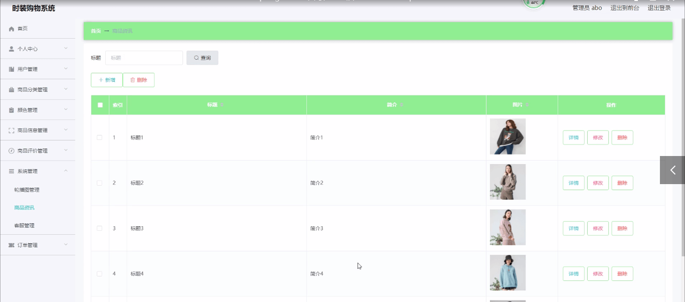 商品资讯,在商品资讯页面中可以查看标题、简介等内容,并且根据需要对商品资讯进行详情、修改或删除等详细操作,如图5-6所示。