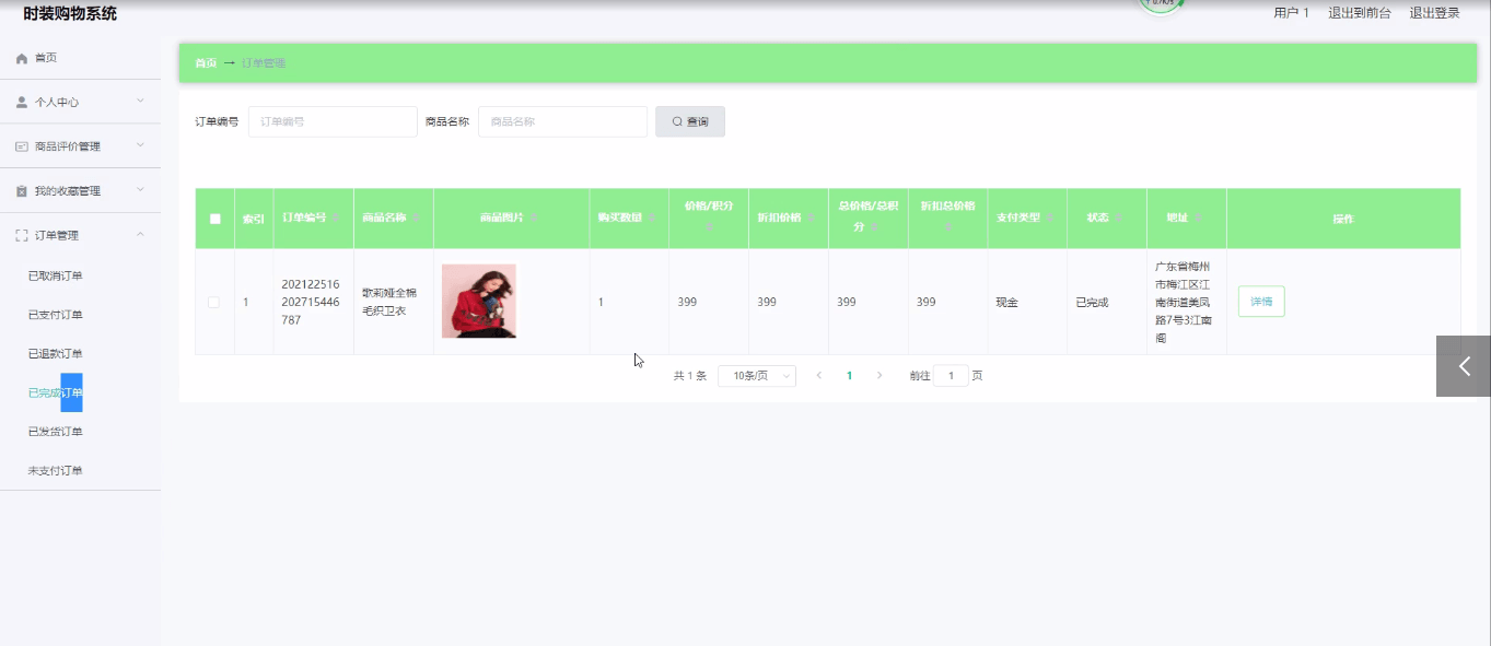 用户登录进入时装购物系统可以查看首页、个人中心、商品评价管理、我的收藏管理、订单管理等内容。