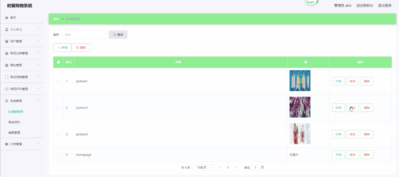 轮播图;该页面为轮播图管理界面。管理员可以在此页面进行首页轮播图的管理,通过新建操作可在轮播图中加入新的图片,还可以对以上传的图片进行修改操作,以及图片的删除操作,如图5-7所示。