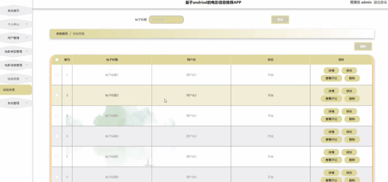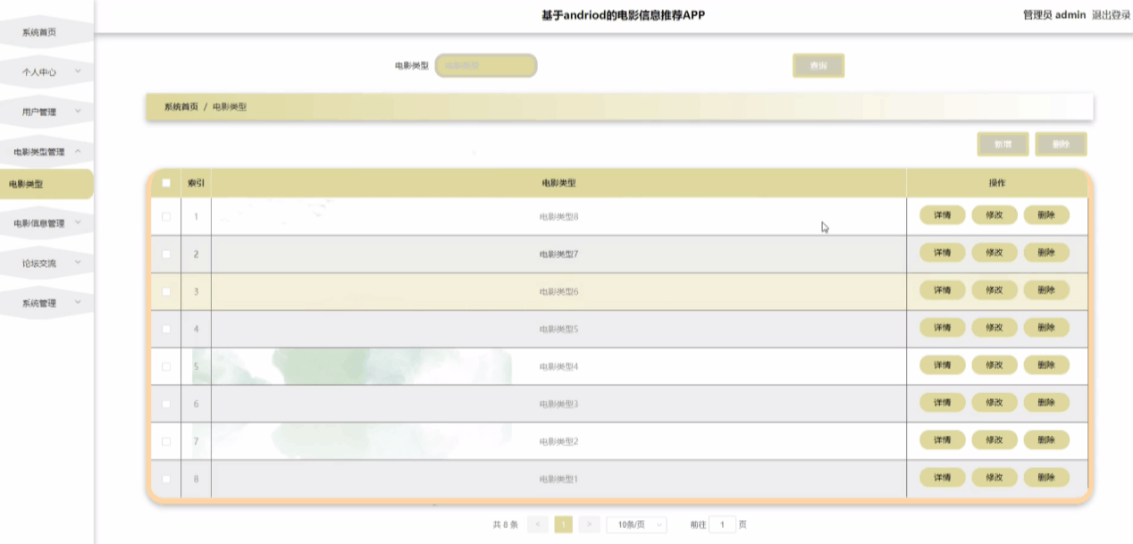 (1)功能要求:管理人员可以管理自己的用户、电影类型、电影信息、论坛交流等进行管理。