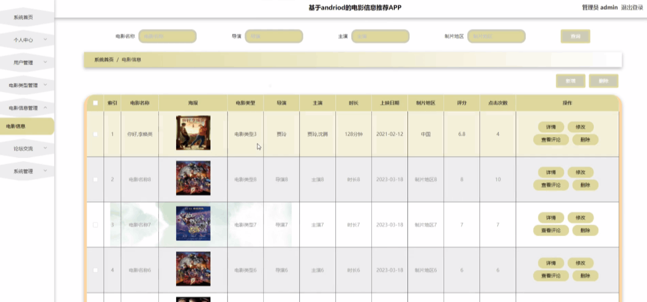 管理员点击电影信息管理:在电影信息管理页面,可以对电影名称、海报、电影类型、导演、主演、时长、上映日期、制片地区、评分、点击次数等信息,进行查询、新增、查看评论或者删除电影信息等操作,如图5-6所示:
