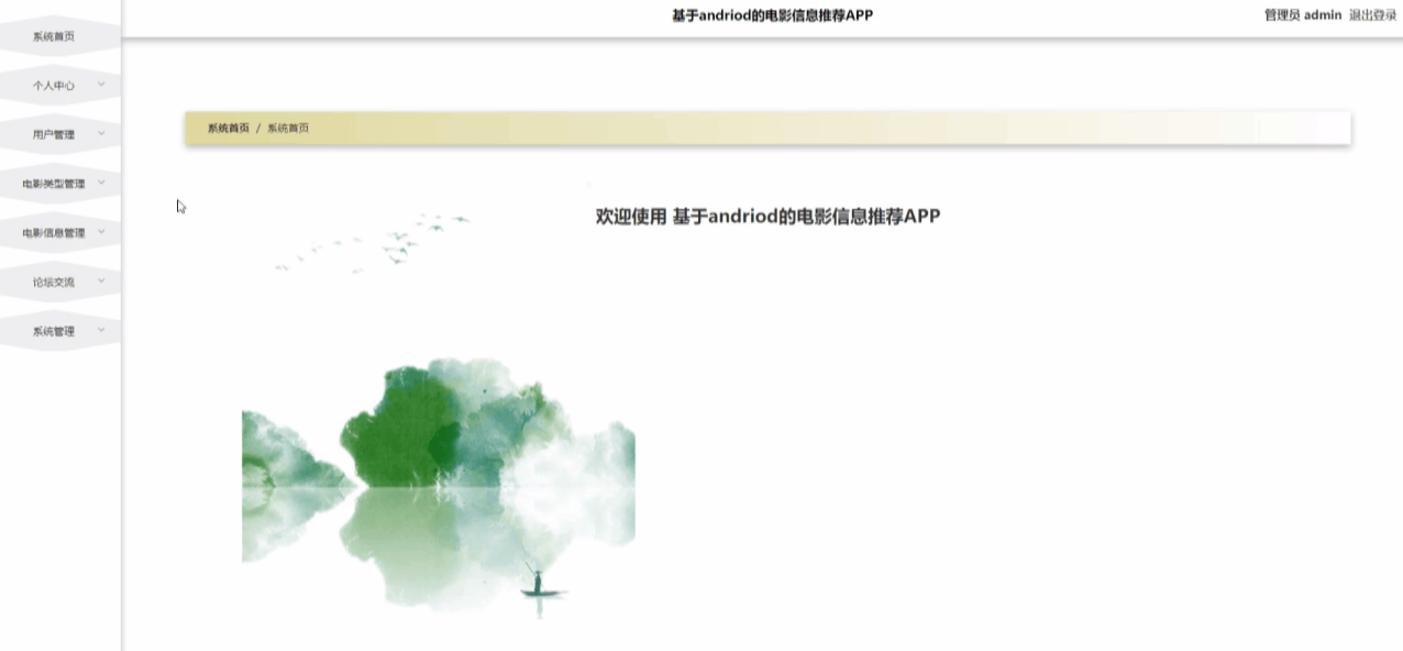 管理员进入主页面,主要功能包括对系统首页、个人中心、用户管理、电影类型管理、电影信息管理、论坛交流、系统管理等进行操作。管理员主页面如图5-2所示: