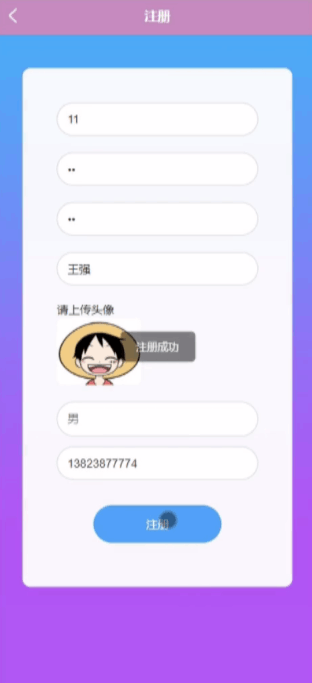 第一次使用本APP的使用者,首先是要进行注册,点击"注册",然后就会进入到注册的页面里面,将用户信息录入注册表,确认信息正确后,系统才会进入登录界面,用户登录成功后可使用本APP所提供的所有功能。用户注册界面如图5-9所示。
