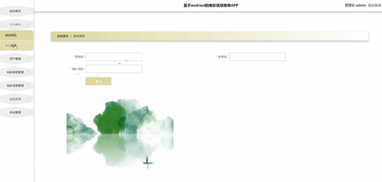 管理员密码修改功能:每一个新的管理员都可以修改密码,在这里修改密码时有一定的限制要求,原密码正确,新密码以及确认新密码输入的内容必须一致,点击确认方可完成修改。二者有其一不满足要求,则修改失败。在这里新密码和确认密码都是使用的掩码,对于密码修改,目的在于,如果更换管理员时,管理员可以将密码进行修改,以保证后台的安全性,也确保网站的安全性,如图5-3所示: