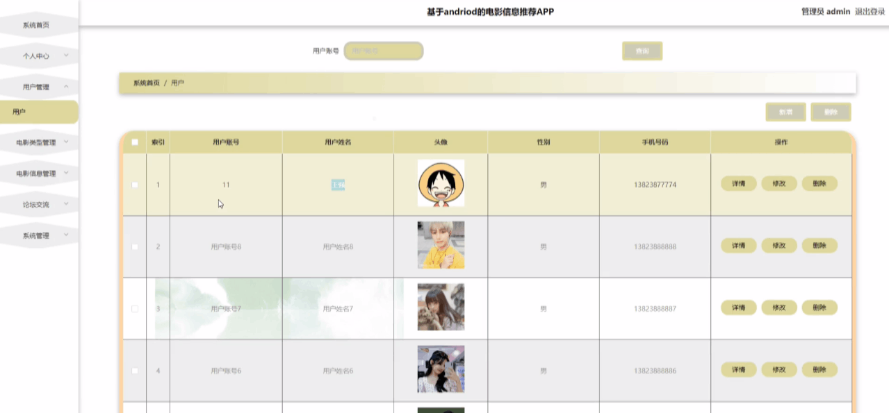 管理员点击用户管理:在用户管理页面,可以对用户账号、用户姓名、头像、性别、手机号码等信息,进行查询或者新增、修改、删除用户信息等操作,如图5-4所示: