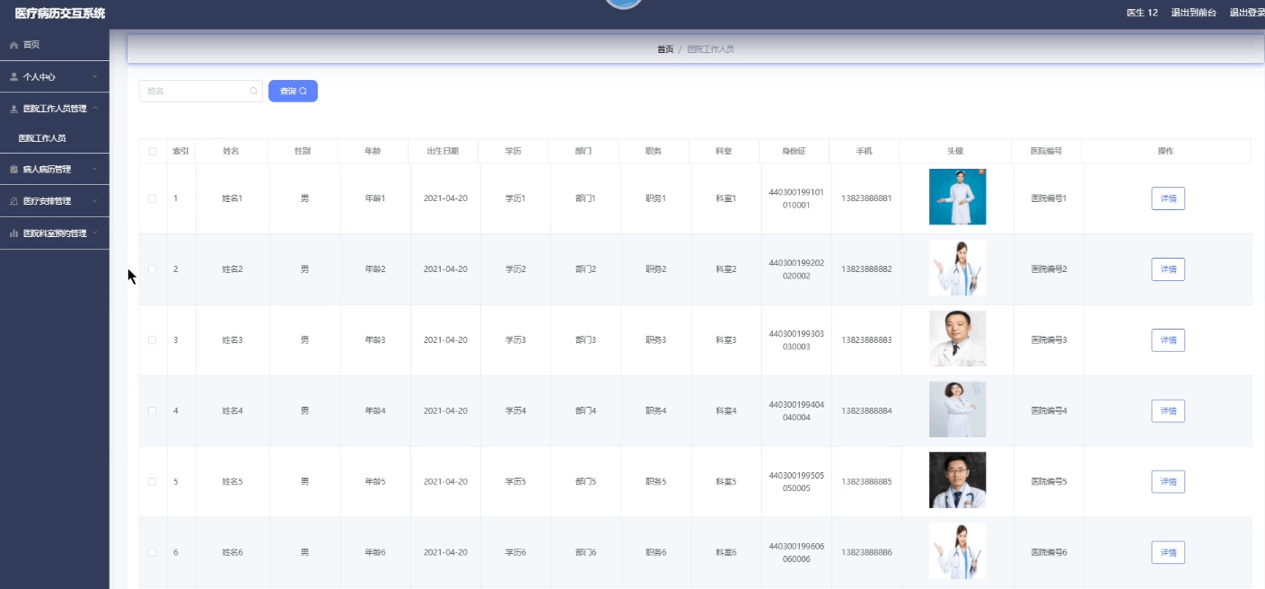 医生可以在医院工作人员界面查看医院工作人员人员。医院工作人员页面的运行结果如图5-3所示: