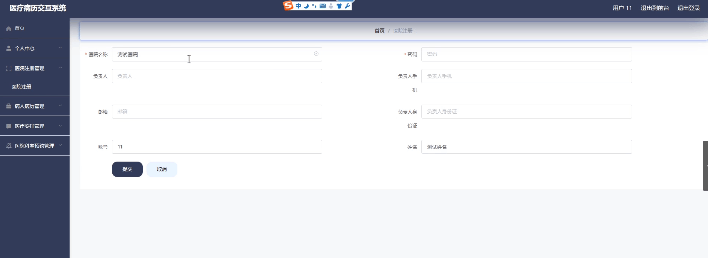 用户可以在医院注册界面对注册医院信息。医院注册页面的运行结果如图5-3所示:
