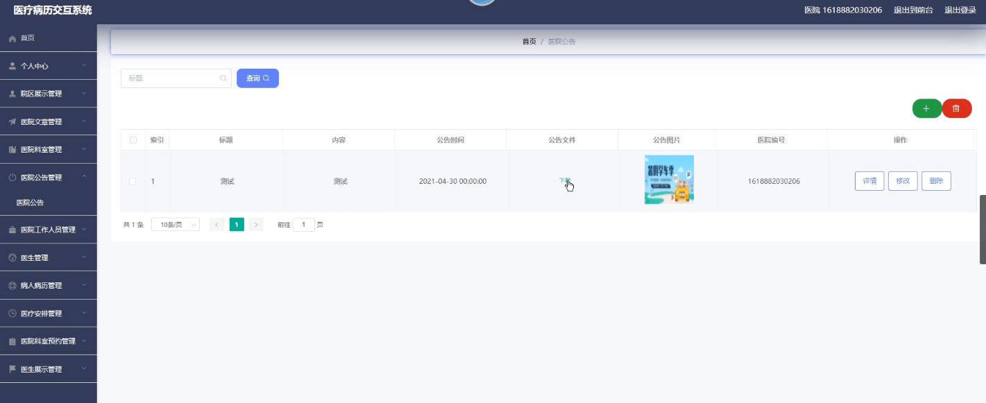 医院可以在医院公告界面对医院公告信息进行添加,修改,删除,查询等操作。医院公告页面的运行结果如图5-3所示: