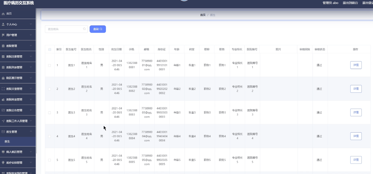 管理员可以在医生信息界面对医生信息进行查看以及查询操作。医生信息页面的运行结果如图5-3所示: