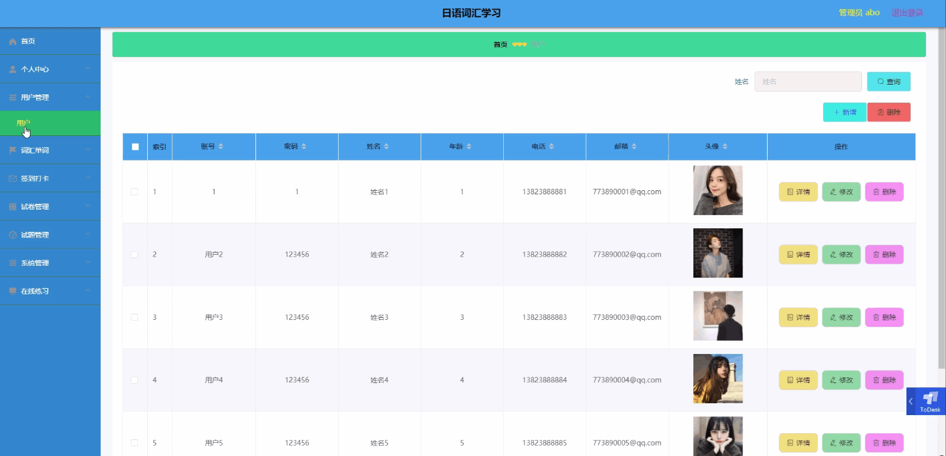 用户管理,通过填写账号、密码、姓名、年龄、电话、邮箱、头像等信息进行详情、修改、删除操作,如图5-14所示。