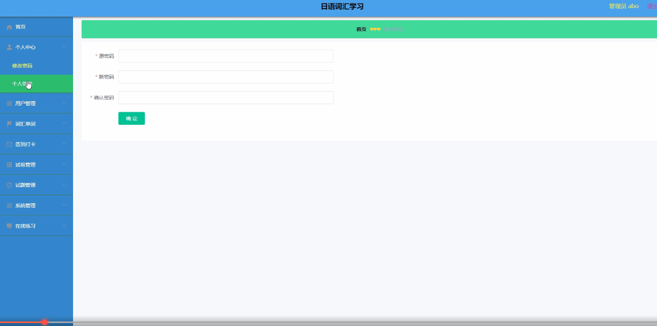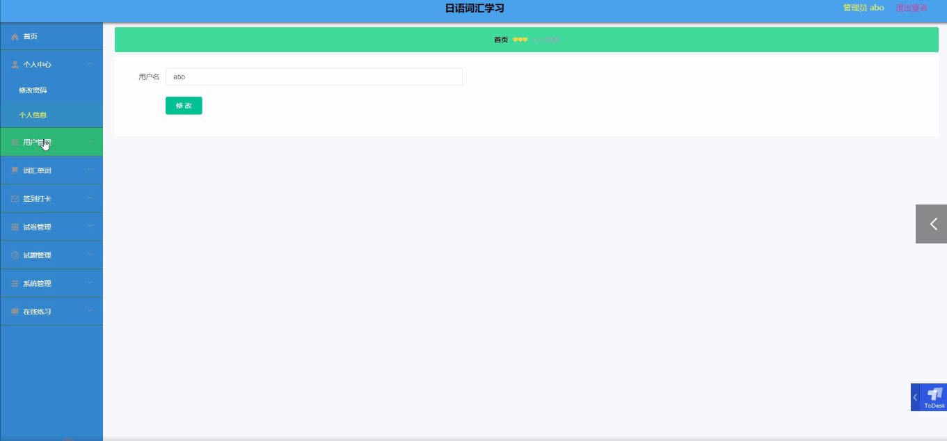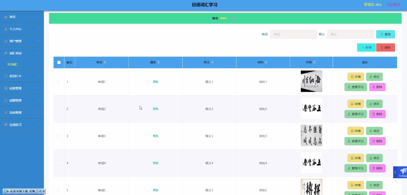 日语词汇学习小程序客户端要求在系统的安卓上可以运行,主要实现了词汇单词和签到打卡信息等相关信息的查看,并且根据需求进行对管理员后端;首页、个人中心、用户管理、词汇单词、签到打卡、试卷管理、试题管理、系统管理、在线练习,用户前端;首页、N2词汇、签到打卡、我的等主要功能模块的操作和管理。