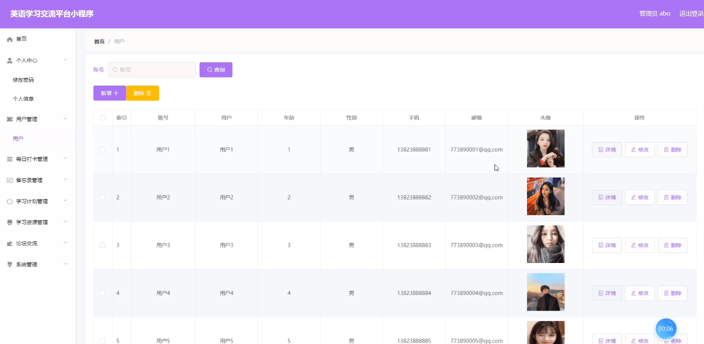 管理员可以管理用户信息,可以对用户信息添加修改删除。具体界面的展示如图5.1所示。