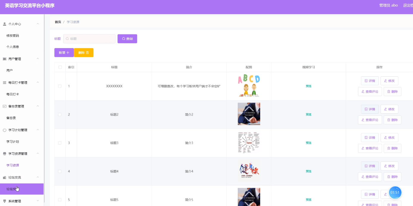 系统管理员可以对学习资源进行增删改查操作。界面如下图所示: