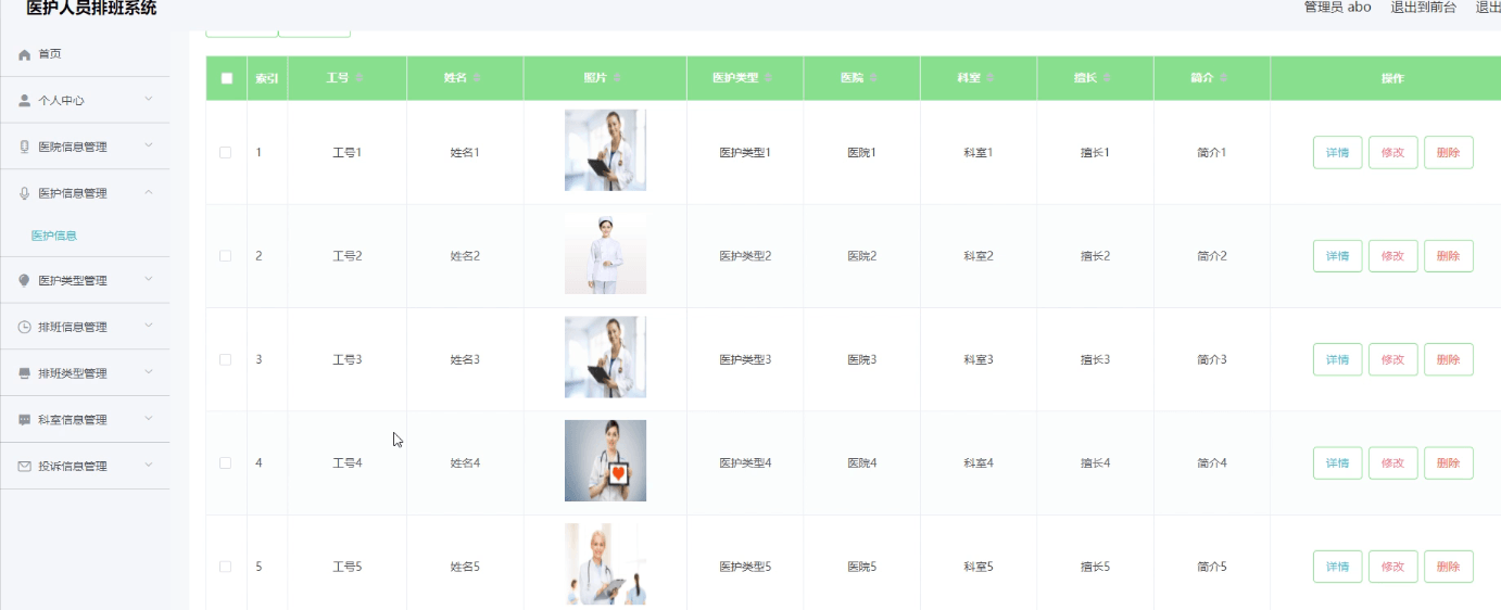 本医护人员排班系统管理员,医护。管理员功能有个人中心,医院信息管理,医护信息管理,医护类型管理,排班信息管理,排班类型管理,科室信息管理,投诉信息管理。医护人员可以修改自己的个人信息,查看自己的排班信息,查看我的收藏信息。因而具有一定的实用性。
