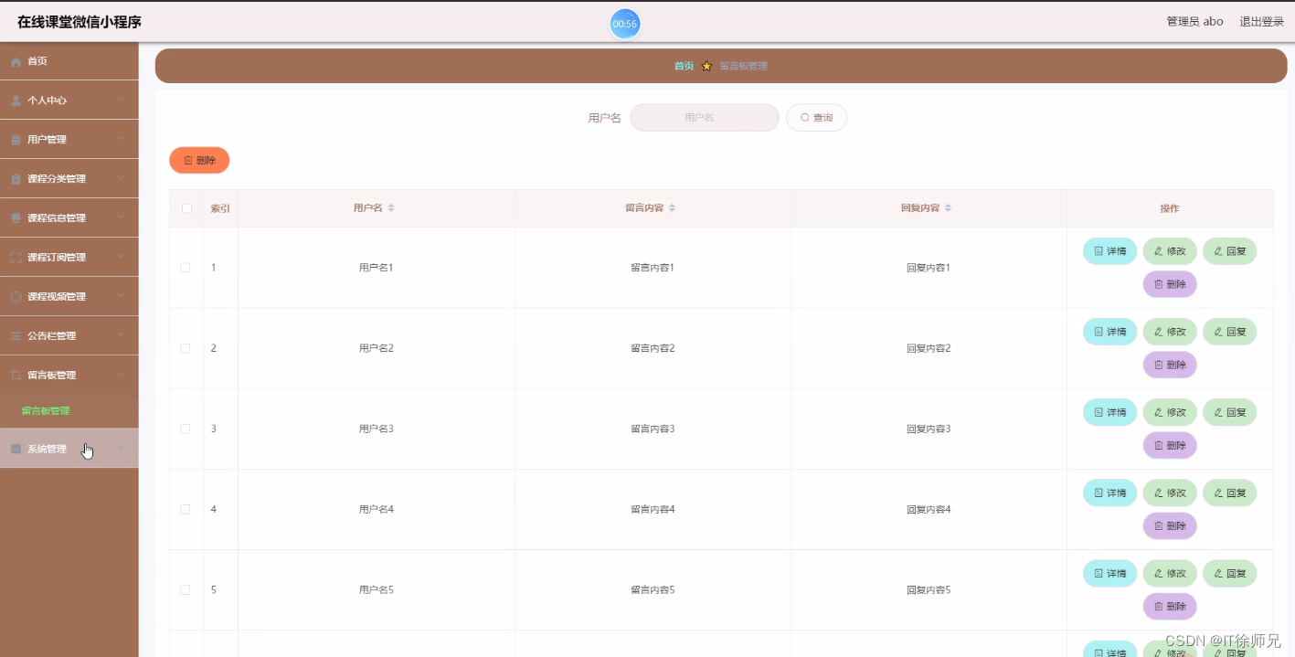 管理员进入留言板管理页面可以查看用户名、留言内容、回复内容等信息,进行详情、修改、回复、删除操作,如图所示。