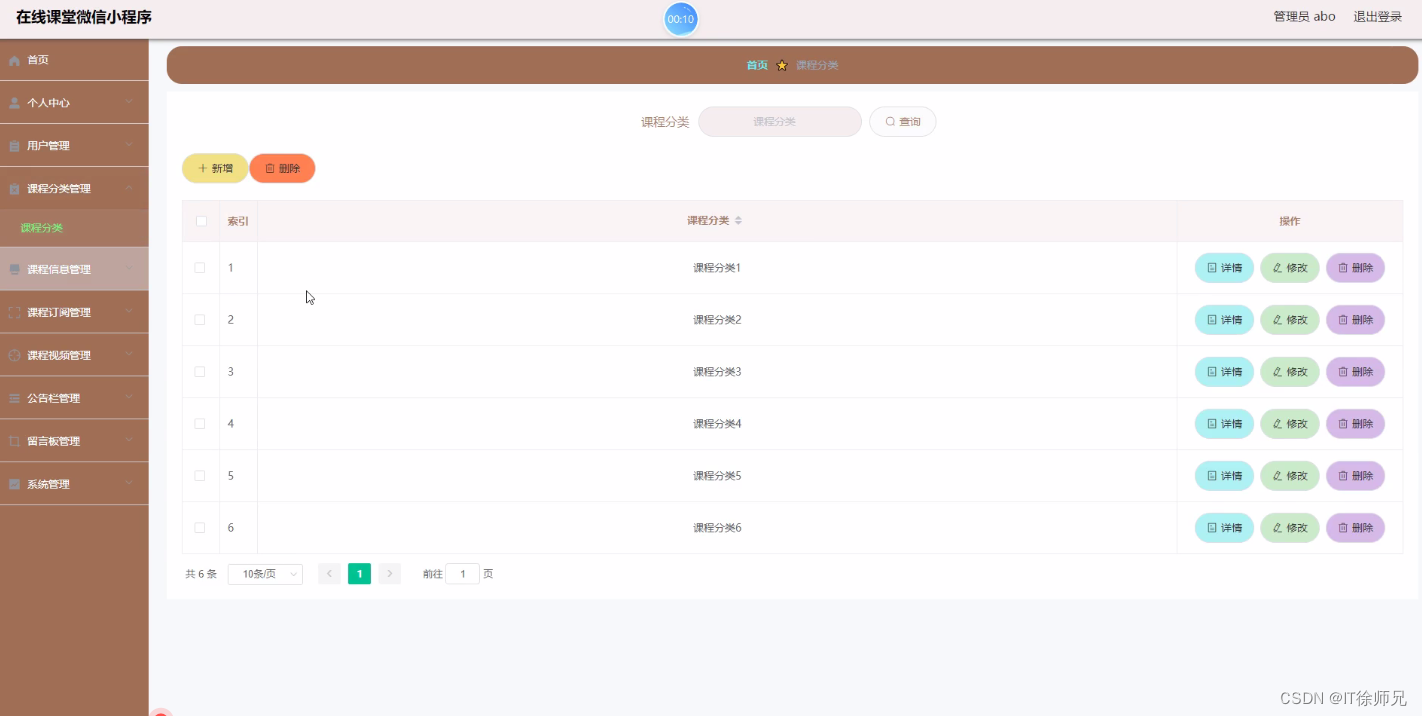 管理员进入到课程分类管理页面可以查看课程分类等信息,进行详情、修改、删除操作,如图所示。