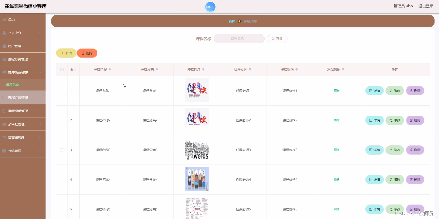 管理员进入到课程信息管理界面可以查看课程名称、课程分类、课程图片、任课老师、课程价格、预览视频等信息,进行详情、修改、删除操作,如图所示。