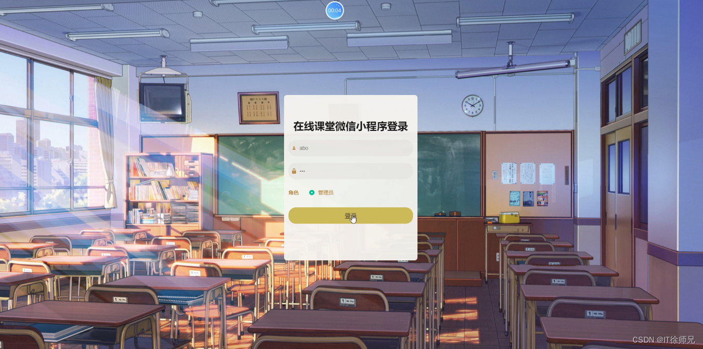 管理员通过在线课堂微信小程序进行确认,管理员进入到在线课堂微信小程序主界面,管理员进入到操作界面,通过登录窗口进行在线填写用户名和密码、角色进行登录,登录成功后进入到系统操作界面进行相应信息的获取,如图所示。