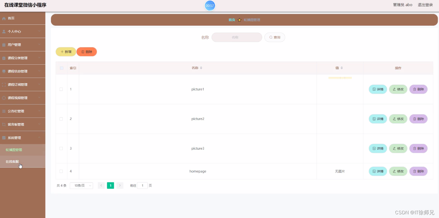 轮播图;该页面为轮播图管理界面。管理员可以在此页面进行首页轮播图的管理,通过新建操作可在轮播图中加入新的图片,还可以对以上传的图片进行修改操作,以及图片的删除操作,如图所示。