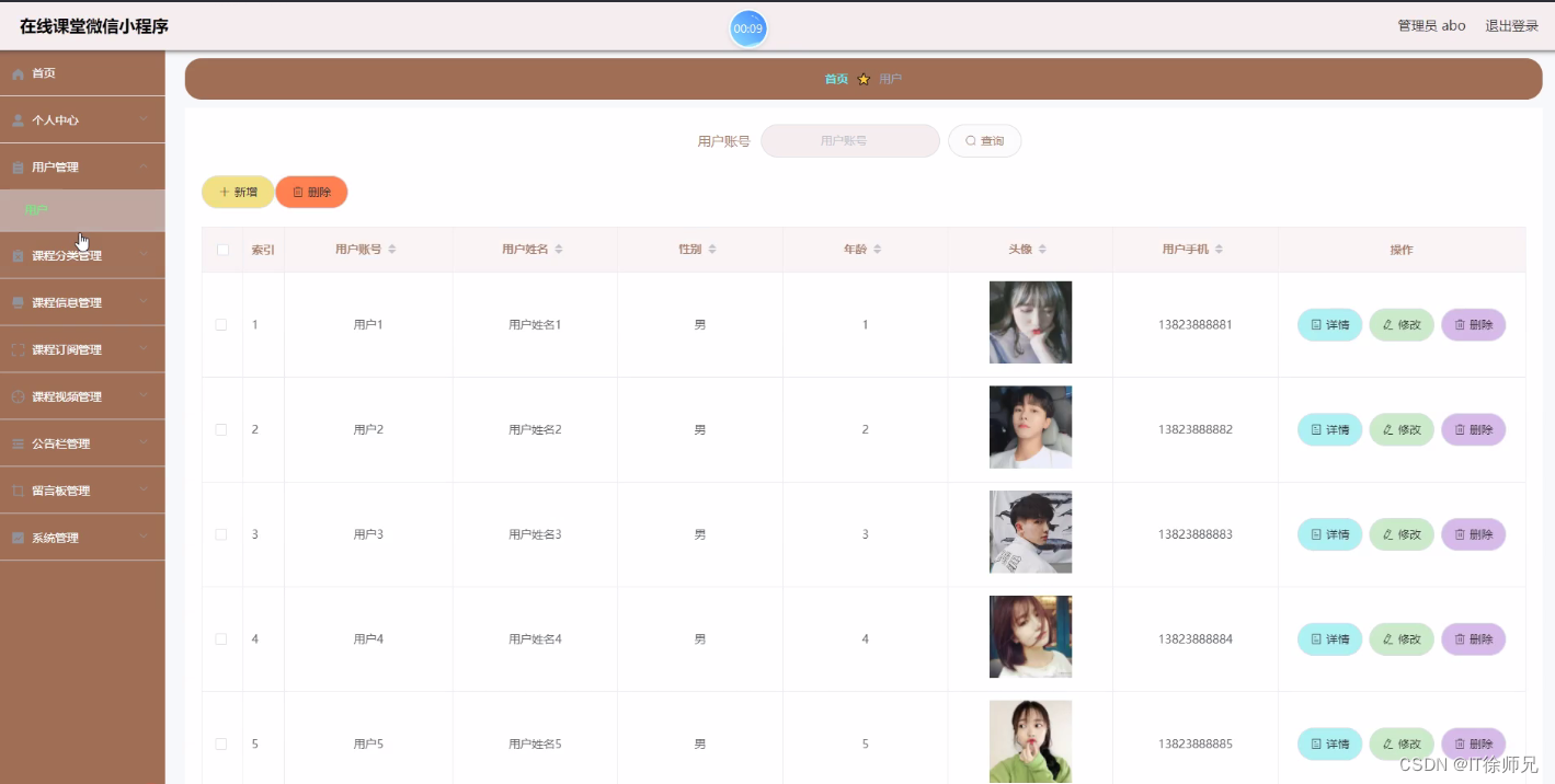 管理员进入到用户管理页面可以查看用户账号、用户姓名、性别、年龄、头像、用户手机等信息,进行详情、修改、删除操作,如图所示。