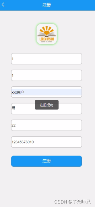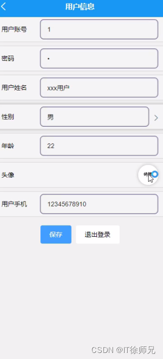 用户进入用户信息页面可以填写用户账号、密码、用户姓名、性别、年龄、头像、用户手机等信息,进行保存、退出登录操作,如图所示。