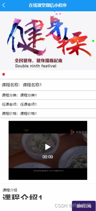 用户进入课程信息页面可以查看课程名称、课程分类、课程图片、任课老师、课程价格、预览视频、课程介绍等信息,进行课程订阅、点我收藏操作,如图所示。