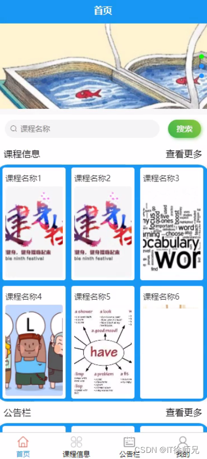 用户首页页面可以查看首页、课程信息、公告栏、我的等信息,进行相对应的操作,如图所示。