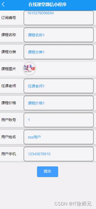 用户进入课程订阅页面可以填写订阅编号、课程名称、课程分类、课程图片、任课老师、课程价格、用户账号、用户姓名、用户手机等信息,进行提交操作,如图所示。